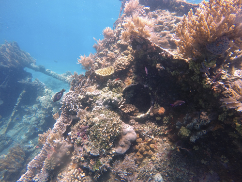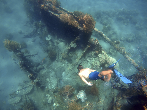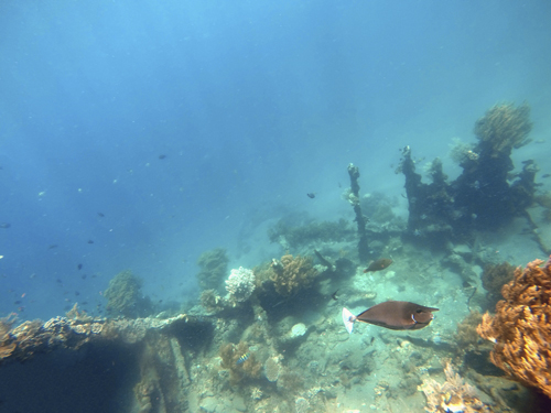 Se cree que era una lancha de patrulla japonesa de la Segunda Guerra Mundial pero no abunda la información. La estructura está rota pero se aprecia con facilidad y está ubicado a pocos metros de la costa. Llegarás hasta el rápidamente desde la orilla, su ubicación se identifica gracias a dos boyas negras.