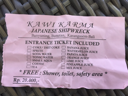 Realmente no hay coste de entrada para acceder al barco japonés hundido en Amed, está en la playa y puedes ir por libre sin pagar nada. Pero en el caso que vayas con moto, que es lo más habitual, si aparcas en la primera entrada que encuentras si vas desde Amed te cobrarán 20.000 rupias por persona (1,31€). Dicho así parece un timo pagar por aparcar y entrar a la playa pero en ese caso está bastante bien. En el precio del parking te incluyen una bebida, guardar tus cosas y ducha de agua dulce. Así que no está nada mal, yo me tomé un zumo de papaya al salir del agua que normalmente cuesta 10-15 mil rupias así que el precio por persona no me parece nada mal teniendo en cuenta que incluye parking, bebida y vigilancia.