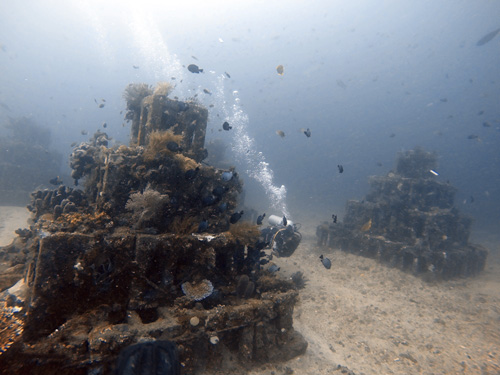 4- Pyramids: un punto muy divertido en el que se encuentran unas estructuras fondeadas por lugareños con el objetivo de crear más vida marina para actividades pesqueras. Hoy en día la pesca no está permitida pero las estructuras con forma piramidal y vida marina quedan ahí para nuestro disfrute. Es realmente interesante ya que vas descubriendo vida poco a poco en las diferentes estructuras. Vimos cantidad de vida marina pero eso sí… tienes que explorar entre las estructuras.