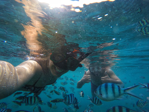 - Avistamiento de tiburones en libertad. Si estás atento durante tu snorkel es fácil que puedas ver los conocidos como Reef Shark, tiburones con punta negra en la aleta que indica que no son agresivos. Nosotros siempre los vimos en el mismo punto, concretamente en el coral de alrededor de una pequeña cala. Para llegar debes pasar caminando la playa donde está Quimi Restaurant, una vez lo hayas pasado debes seguir caminando hasta llegar a un puente roto donde tienes dos opciones: seguir por el agua haciendo snorkel o seguir caminando bajando del puente a las rocas. Después del puente roto viene una playa y, después de ésta, llegas a una pequeña cala. Es aquí donde nosotros vimos los tiburones varías veces. Alrededor de esa cala hay bastante coral y es por donde suelen moverse. Los fines de semana vienen barcos de tours organizados con muchos locales, los llevan a este punto y, como la gran mayoría no sabe nadar, hacen mucho ruido asustando a todos los animales. así que mi recomendación es que intentes explorar esta zona de lunes a jueves.