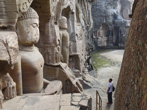 Para mi fueron las figuras más espectaculares, impresionante verlas sin gente y de forma gratuita. Estábamos solos, en silencio y sin restricciones. Únicamente debes dejar tus zapatos en el inicio del camino. Sin duda unos colosos espectaculares que no esperas ver en India y que por momentos pueden recordar a algunas escenas de Egipto. Verás que muchas figuras no tienen cara o están picadas para dañarlas de forma intencional, algo que también pasa en Egipto. Y es que las tallas son de la religión jainista pero en una época posterior de control musulmán se dañaron, ya que en el Corán no permite la representación de Dioses con forma humana. Por este motivo se les extrajo la cara que muchos años después algunas de ellas se reconstruyeron.
