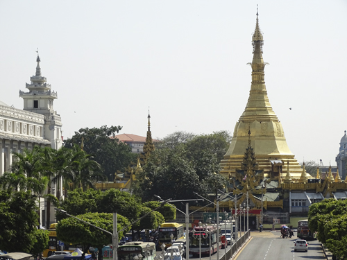 Situada en medio de una rotonda y junto al parque Maha Bandula tiene una entrada de 3 dólares. Te dicen que dejes los zapatos en una consigna al entrar pero al salir te harán pagar por ello, así que mi recomendación es que lleves una bolsa para entrar los zapatos contigo. Una bonita foto de esta pagoda es desde uno de los puentes de la avenida principal.